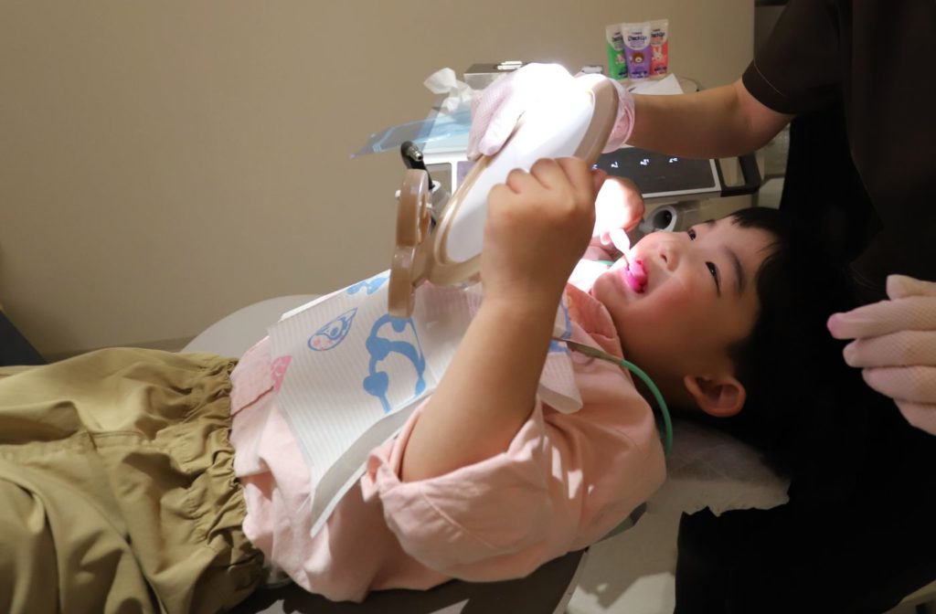 検診ではクリーニングや虫歯のチェックはもちろん、子どもの成長に合わせたホームケアのコツや注意すべき点を伝え、歯磨き練習を行います。見た目では分からない虫歯もレントゲンを撮ると分かる場合もあり、定期的なチェックが虫歯の予防や早期発見に役立ちます。