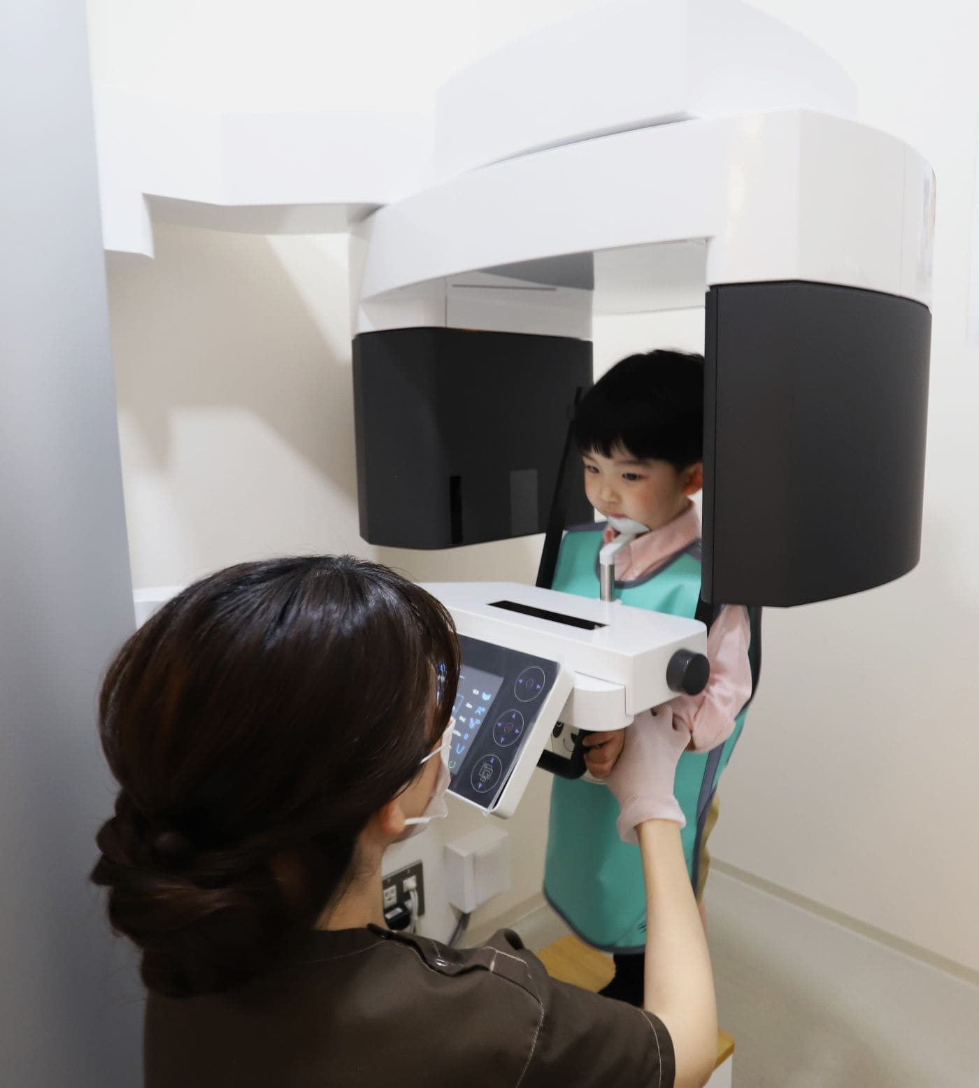 レントゲン撮影は乳幼児には難しいので、4・5歳を目安に1年か半年に1度くらいの頻度で行います。歯科で撮影するレントゲンは日常生活で受ける自然放射線量よりはるかに少なく、その上防護用エプロンを着用しますので安心安全に受けていただけます。