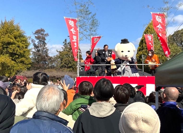 町公式キャラ「雪丸」も登場。まかれる豆には当たり付きのモノがあり、素敵な景品をゲットできる。美味しい食べ物の販売や茅の輪くぐり、縁日など楽しい企画が充実。