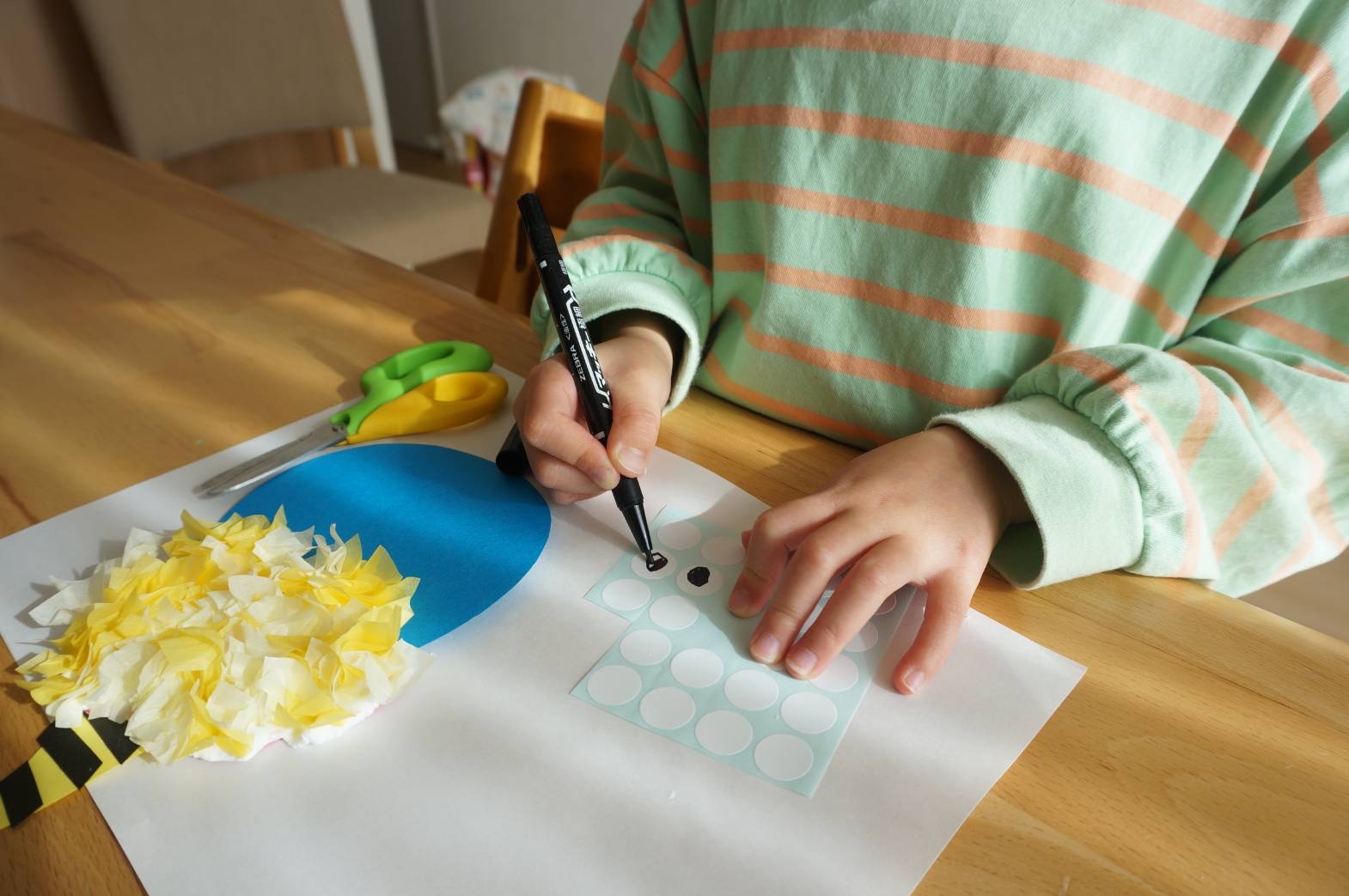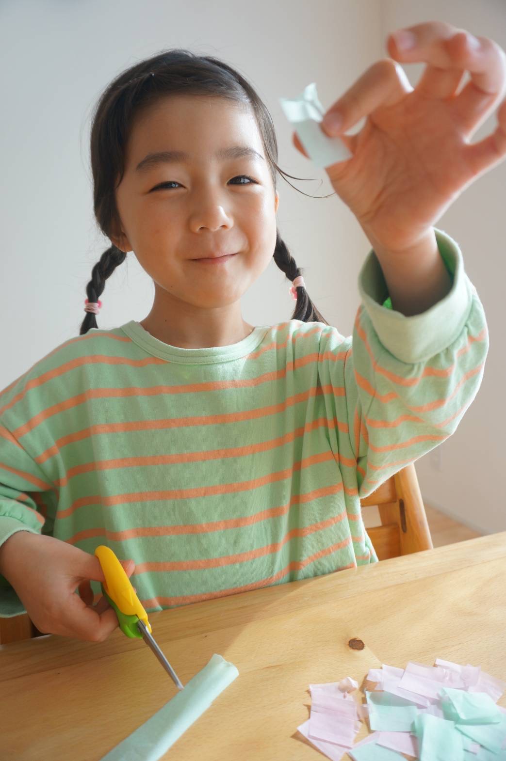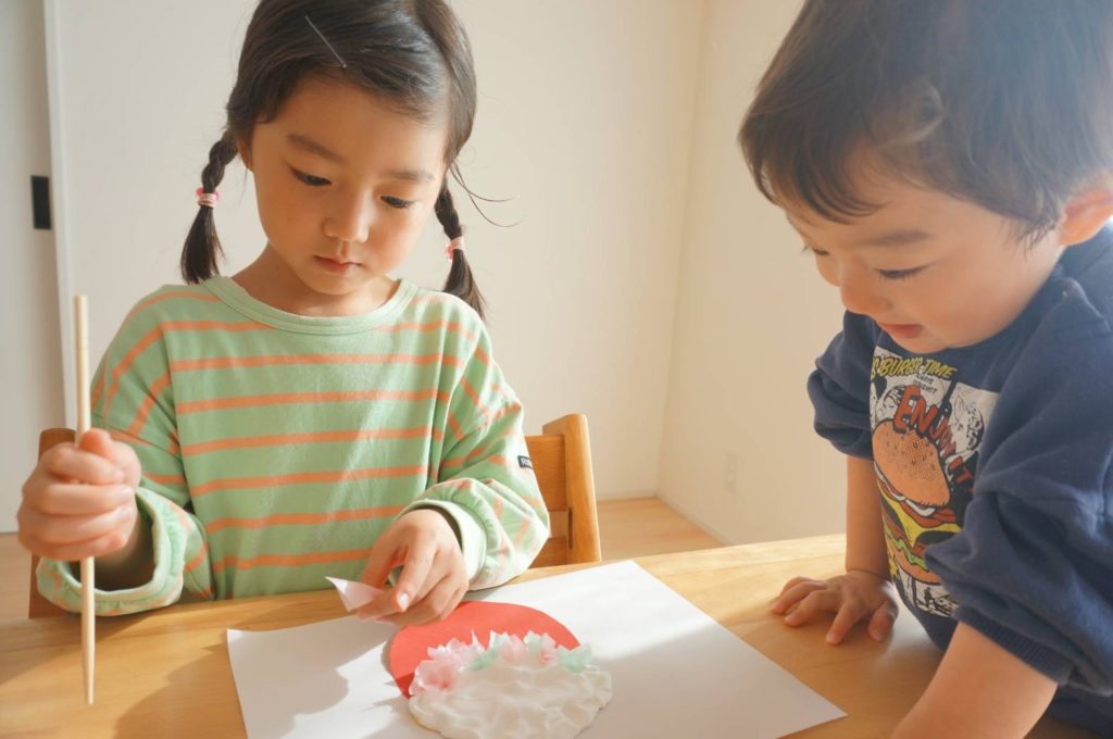 最初は「おにつくるの?」「こわくない?」と言っていましたが、作り始めると、「これも自分でやってみる!」ととても楽しそうでした。出来上がるとパパや弟にも見せていて、とても楽しい工作の時間となりました♪